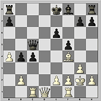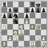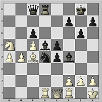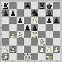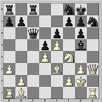 13...exd5 14.exd5 Kd8 15.Nc6+ Bxc6 16.dxc6 Nb6 17.Bh4 Rg8 18.Re2! d5! 19.Bxh7 Rh8? 20.Rde1 Nc8 21.Qxg7! Qxf4+ 22.Kb1 Rxh7. Умелыми маневрами фигур белые расшатали крепость черного короля и теперь наносят завершающий таранный удар: