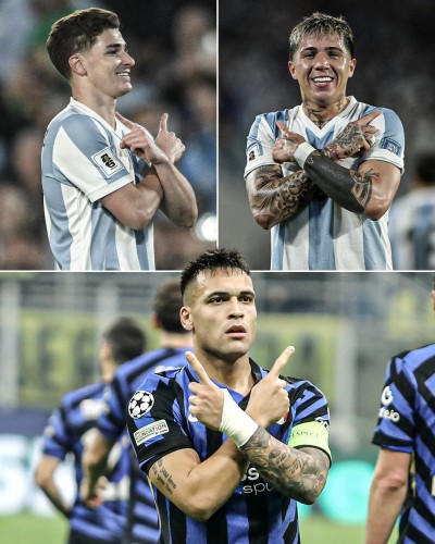 | После того, как Хулиан Альварес и Энцо Фернандес забили оба гола, они отпраздновали гол Лаутаро Мартинеса, который сегодня из-за травмы выбыл из игры за сборную Аргентины.❤️ |