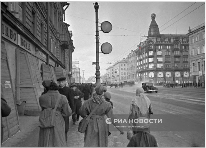 Горожане идут по проспекту 25-го Октября (ныне - Невский проспект) в блокадном Ленинграде. |