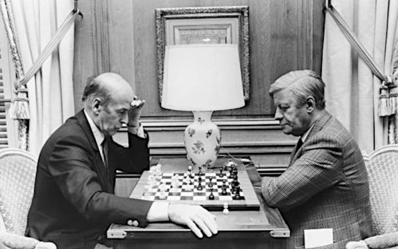 Бывший президент Франции Валерий Жискар д'Эстен играет в шахматы с бывшим канцлером Германии Гельмутом Шмидтом в офисе-библиотеке замка Л'Этуаль, родине Д'Эстен в Аутоне, Луар-э-Шер, в 1983 году.
