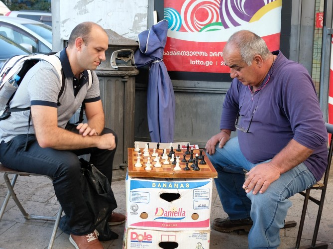 Игра в шахматы с уличным торговцем в Тбилиси. Я купил у него книгу по шахматам, и он вызвал меня на игру...