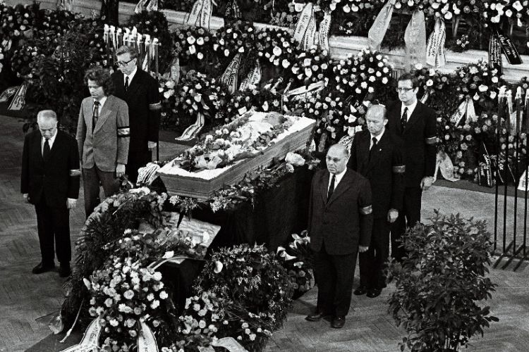 У гроба стоят: Сало Флор, Борис Спасский, Василий Смыслов; Виктор Батуринский, Иво Ней, Юрий Авербах. |