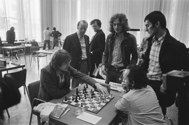 | Амстердам, IBM, 13-й тур, 23 июля 1975 года. Флорин Георгиу (Румыния) и Ханс Бём (Нидерланды) анализируют позицию; у доски стоят: Вольфганг Ульман (ГДР), Ханс Рее и Ян Тимман (Нидерланды), Владимир Раичевич (Югославия). |