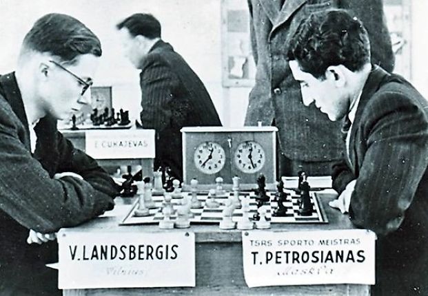 | Вильнюс, март 1951 года. Чемпионат Литовской ССР по шахматам. Ландсбергис - Петросян, который вместе с Лилиенталем и Симагиным участвовал в турнире «вне конкурса». Ратмир Холмов занял 1 место. |