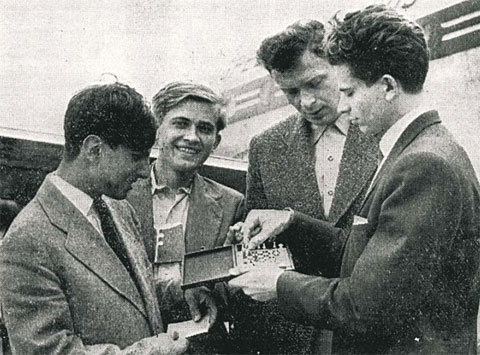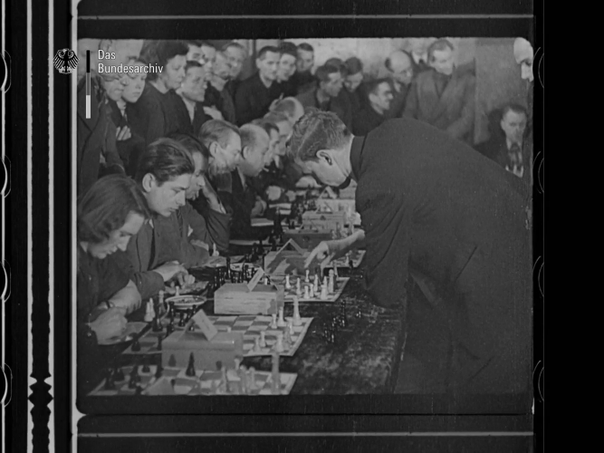 | По пути в Гаагу на матч за звание чемпиона мира по шахматам в 1948 году пятеро советских шахматистов провели сеансы одновременной игры в Берлине. Их общий результат против сильнейших берлинских шахматистов составил +69, −15, =37. С отметки 2:13 на видео можно увидеть в действии Рагозина и 26-летнего Смыслова. |