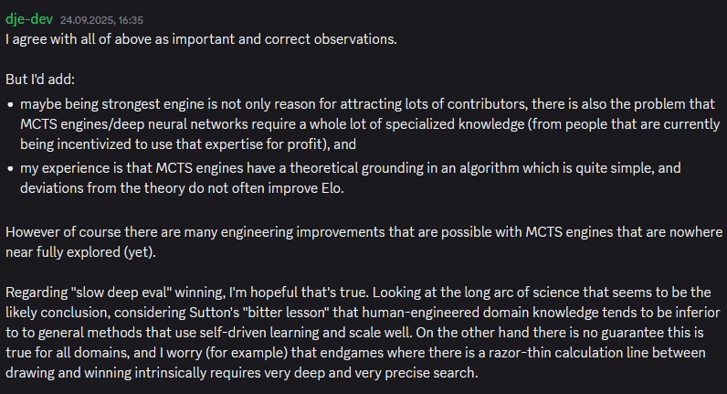 Regarding "slow deep eval" winning, I'm hopeful that's true. Looking at the long arc of science that seems to be the likely conclusion, considering Sutton's "bitter lesson" that human-engineered domain knowledge tends to be inferior to to general methods that use self-driven learning and scale well. On the other hand there is no guarantee this is true for all domains, and I worry (for example) that endgames where there is a razor-thin calculation line between drawing and winning intrinsically requires very deep and very precise search.