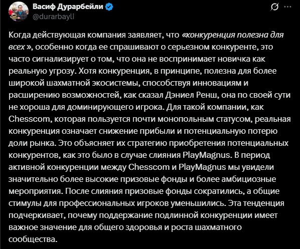 Таким образом чесском является безусловным монополистом в просто онлайн-шахматах (явно больше 50% людей играет именно там) и тем более является безусловным монополистом в игре в шахматы на деньги / в шахматах высоких достижений (потому что единственный его возможный даже теоретически конкурент никаких ТТ и более денежных турниров не проводит).