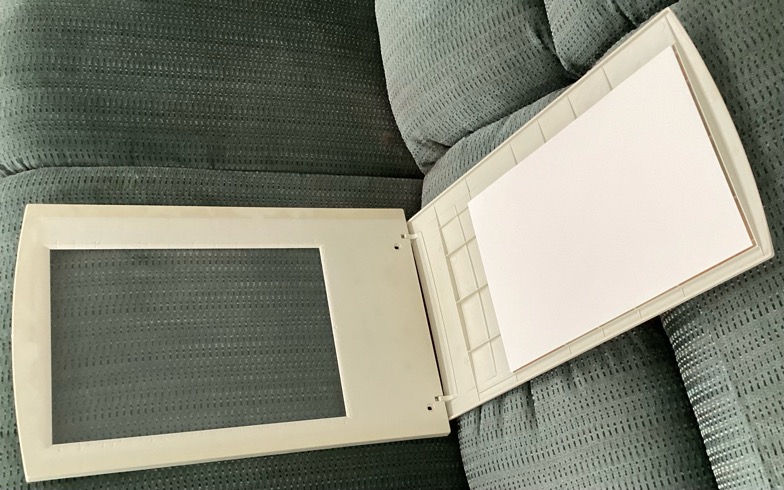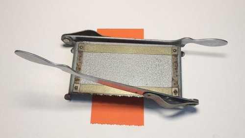 Фотоувеличители в СССР продавались либо с вертикальной штангой, либо с кронштейном. Почему-то передвижение оптики относительно плоскости фотобумаги предлагалось только этими двумя способами. Я купил Ленинград-2 с кронштейном. У товарища был со штангой и покупали для меня мы вместе. Уж не помню почему остановились на этой модели, может, потому, что он стоил всего 17 рублей и нужно было купить еще красный фонарь, ванночки и доску с кадрирующей рамкой. Такой: