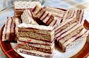 Стряпню я ел исключительно, читая книжку, а штрудель осыпался и отвлекал. Поэтому я читал с магазинным печеньем. Из магазинного печенья я больше всего любил «Союзное». Оно было как вафли с прослойкой из варенья или повидла, но гораздо толще (много слоев), толщина несколько см. Вот как это по толщине, но все внутренние слои между вареньем были одинаковые, как указанный стрелочкой. Сытное и вкусное, я не мог остановиться пока все не съем.
