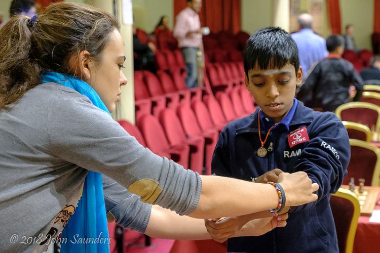 Шэрон Рэйчел, одна из участниц турнира, захотела пить, и один из волонтёров соревнования — Вивек Джоши — предлагает ей воду.