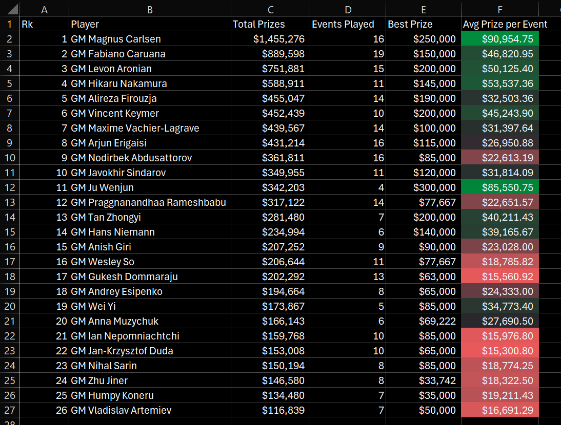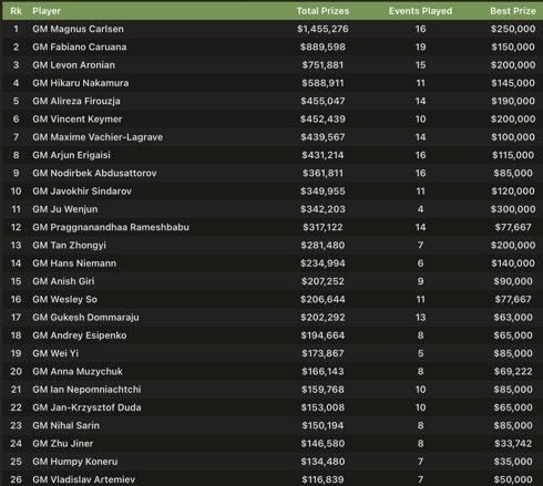 | В общей сложности 26 игроков достигли шестизначных сумм в 2025 году. Это значительное увеличение по сравнению с 17 игроками в прошлом году, благодаря возвращению крупных турниров, проводимых только в нечетные годы, таких как Кубок мира ФИДЕ и Гранд-швейцарский турнир , включению шахмат в Кубок мира по киберспорту и проведению серии Freestyle Grand Slam в течение всего года. |