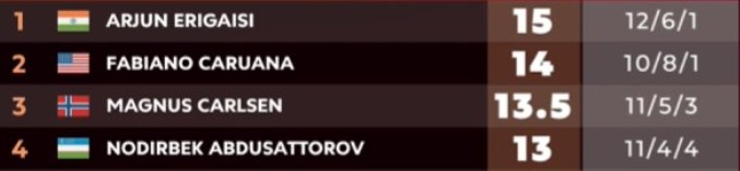 Исломбек Синдаров находится в нижней части таблицы , но наварил 230 рейтинга. Кеф наверно 40. Точно не знаю. В 2014-году стал чемпионом мира по рапиду и блицу до 7- лет. С тех пор не играл что ли. Многие в чате просили показать его партии , но его друзья стримеры (они работают командой) не показали даже не то, что в основной, но и в нижней части окна. Может они друзья медведя.