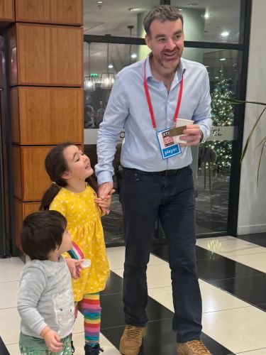 Гавейн Джонс со своими двумя детьми перед началом 2-го дня суперрапида на @xtxmarkets London Chess Classic.