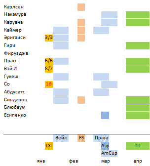 Но у Фаби есть и сложности. Его счёт с Хикару Накомура — 9:13, при этом у Хикару есть недавняя серия из 5-6 классических побед подряд. Он также имеет небольшой минус в личных встречах с Анишем Гири — 4:5, ровно 2:2 с Прагой, и без поражений — 4:0 против Вэйи. При этом он мало играл с остальными участниками турнира. Несмотря на это, невозможно не назвать Каруану главным фаворитом. За последние 10 лет он — самый опытный игрок в классических шахматах, и Магнус сам называет его вторым лучшим шахматистом мира.