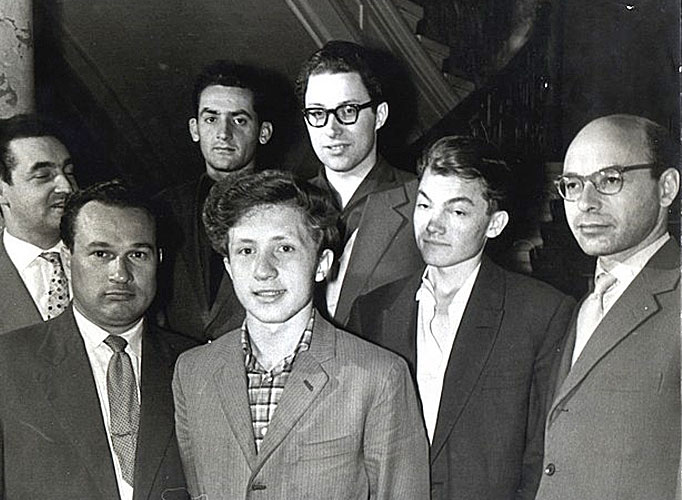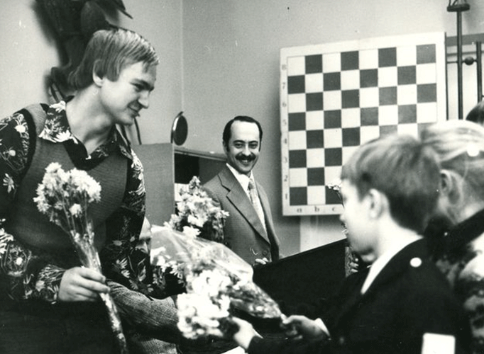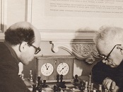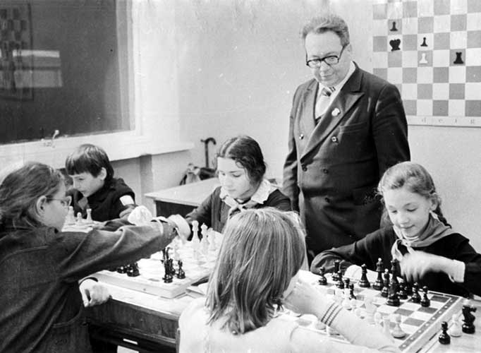 21-й чемпионат СССР: Киев, 7.01–7.02.1954. Обширный зал Дворца культуры работников легкой и пищевой промышленности переполнен.