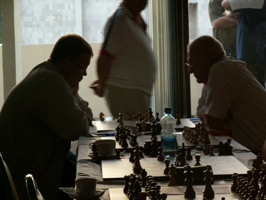 Во время седьмого тура во всем санатории "Дагомыс" неожиданно и надолго пропало электричество. Ловя последние лучи заходящего солнца, Виктор Корчной (справа) успел победить Александра Ластина |