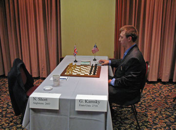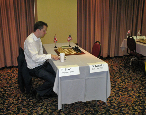 Подошло время начинать, и ровно в пять вечера главный арбитр пустил часы. Запаздывал к началу только Гата Камский. Надо сказать, что чувствовалось некое напряжение по поводу того, как встретятся Н.Шорт и Г.Камский. Небольшая предыстория. Н.Шорт "пошел на вы" заранее: еще перед вторым туром, во время пресс-конференции, он резко ответил на вопрос о предстоящей партии с Г.Камским. Завершая ответ, Н.Шорт сказал буквально, что победа именно в этой игре доставит удовольствие как никакая другая. Накануне он озадачил организаторов, попросив заменить английский флаг, - красный крест на белом поле, - на британский Юнион Джек, хотя надпись о том, что гроссмейстер Н.Шорт представляет именно Англию, не изменилась. Неизвестно точно, была ли эта замена связана с предстоящей партией или нет, "после этого - не значит вследствие этого", но можно предположить, что была.