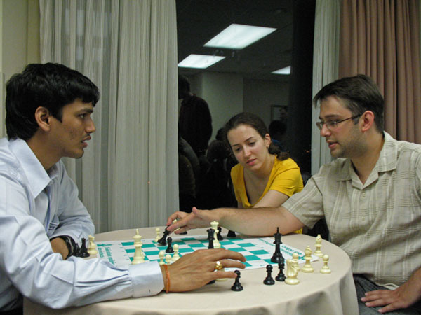 Одни занимаются делом - разбирают партию. Ирина Круш, Петнала Харикришна и Паскаль Шарбонно. |