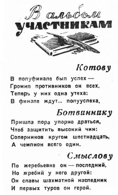 Илья Эренбург: "Приветствую мастеров, которые вносят новизну дерзания в древнейшую игру мира".
