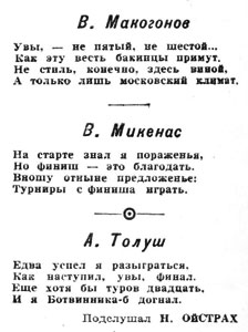 И все же шахматное соревнование — это не расписание поездов. Очень часто в советских турнирах молодежь вносит свои веские коррективы в глубоко научные предсказания "знатоков". Больших достижений я ожидаю от Смыслова".