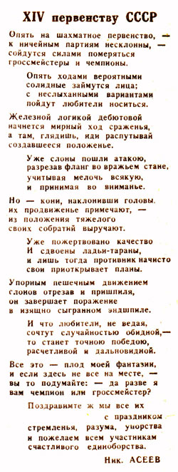 Свое выступление комендант Москвы закончил пророческими словами: «Среди участников XIV первенства имеются ближайшие претенденты на звание чемпиона мира по шахматам, и можно не сомневаться в том, что в недалеком будущем это звание будет носить представитель величайшей державы – СССР».