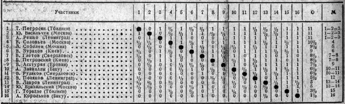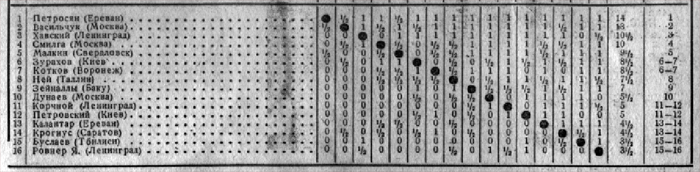 1) В юношеских чемпионатах СССР 1945, 1946 гг., проходивших в Ленинграде, фигурирует загадочная личность – некто Яшин. Разумеется, это не наш прославленный вратарь, хотя по возрасту Лев Иванович вполне подходит. А вот кто этот Яшин – тайна, покрытая мраком. Упоминание о нем мне удалось найти лишь в статье Г. Левенфиша, опубликованной в журнале «Шахматы в СССР» (№ 8-9) за 1946 год. Далее следы Яшина теряются. Мастером, да и вообще шахматистом он, как видно, не стал, а его фамилия перекочевала на страницы печатных изданий – одно из самых известных: двухтомник «The Games of Tigran Petrosian» («Pergamon Chess», 1991), а оттуда – в различные шахматные «базы». И вот совсем недавно, перелистывая старые бюллетени, я наткнулся на воспоминания самих участников этих турниров, Юрия Коткова и Гульбата Торадзе (Бюллетень ЦШК СССР «За шахматную корону», №4 и №11, 1969). По их единодушному свидетельству, никакого Яшина на самом деле не было, а вместо него играл Владлен Зурахов с Украины, ставший впоследствии известным мастером. Не знаю, кого как, но меня эти свидетельства очевидцев убеждают, тем более, что в их статьях приводятся турнирные таблицы (где, кстати, результаты Яшина-Зурахова в точности совпадают), а в статье Ю. Коткова имеется даже фотография всех участников. Чтобы не быть голословным, воспроизвожу эти документы.