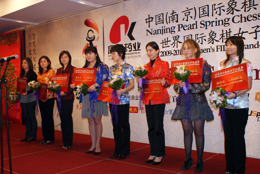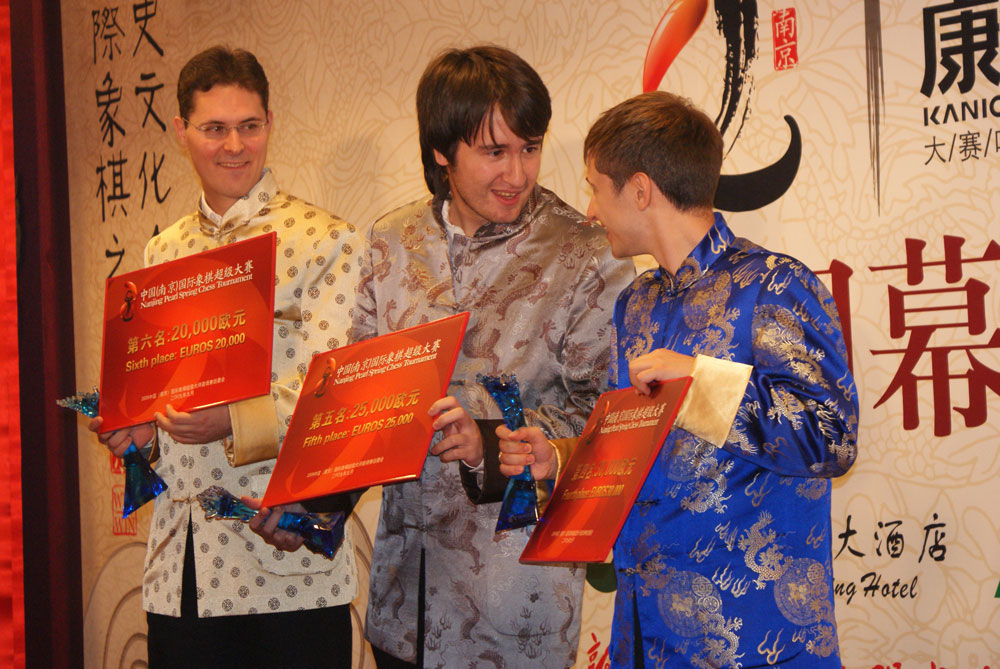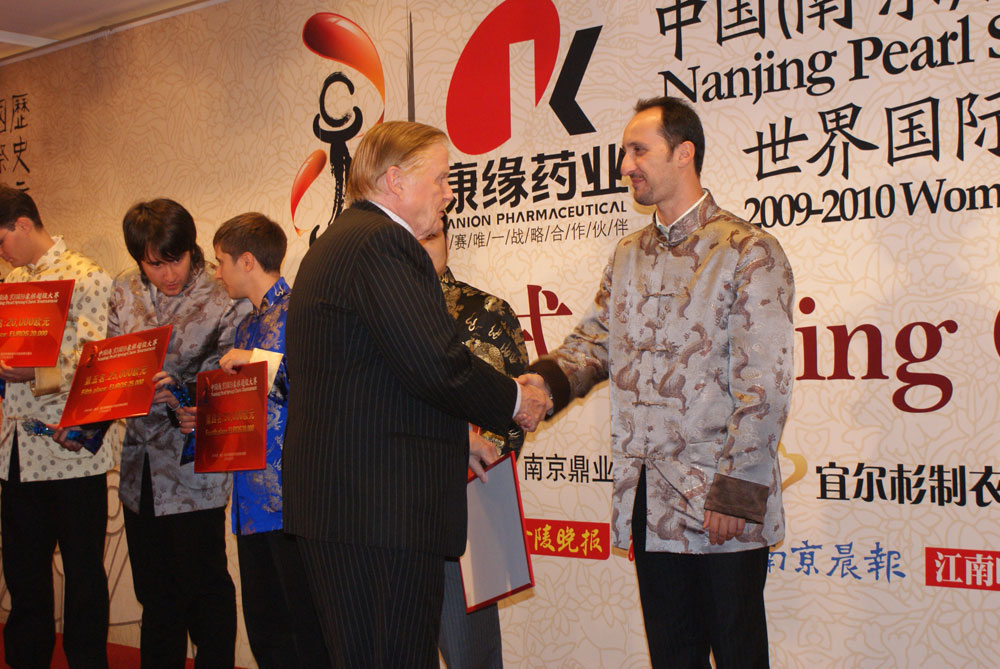 Веселина Топалова награждает Роберт Манделл, канадский экономист, лауреат Нобелевской премии. Именно он выдвинул предложение провести в Нанкине соревнование 6-ти лучших шахматистов мира. В течении пяти лет шли переговоры с руководством Нанкина, согласование всех формальностей. В прошлом году идея наконец-то реализовалась. На пресс-конференции Роберт Манделл пояснил причину проявленной им инициативы: "Думаю, проведение подобного турнира важно по двум причинам. Во-первых, то, что одно из пяти соревнований "Большого шлема" пришло в Китай, делает Китай, Нанкин, значимее на карте мира. Во-вторых, такие турниры способствуют развитию шахмат, а их влияние на общество ни в коем случае нельзя недооценивать. Глядя на историю шахмат, можно сказать, что страны, которые уделяли большое внимание их поддержке, становились сильнее. С 20-х годов прошлого века великая Россия дала миру много выдающихся шахматистов и в то же время стала могущественной страной. Кто следующий? Я вижу, что сейчас ход за Китаем.