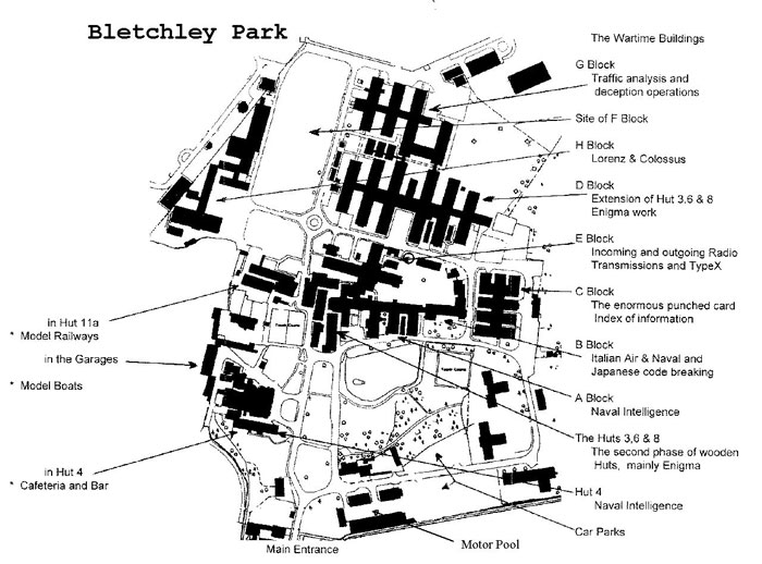 Это был единственный за всю войну случай, когда Блетчли Парк мог пострадать от атаки люфтваффе, и то ведь бомбы предназначались не криптологам. О существовании в этих местах мощнейшего дешифровального центра немецкая разведка и не догадывалась. И дорого бы заплатила, чтобы заполучить эту карту Блетчли Парка со всеми его подразделениями – сугубо дешифровальными (хижины – huts - №№6 и 8), аналитическими (хижины №№3 и 4)…