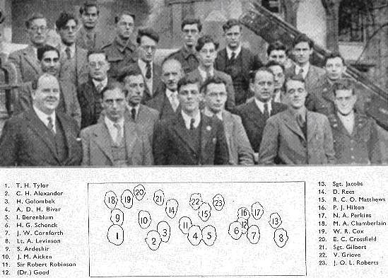 Здесь же, в блоке по взлому телеграфного немецкого шифратора «Лоренц Шлюссельцузатц» (использовавшегося для телеграфной радиосвязи Гитлера и генштаба с командованием армий вермахта) трудились как минимум два других участника матча с оксфордцами – Дэвид Рис (D. Rees), на коллективном фото он под 14-м номером, и Петер Хилтон (Peter Hilton) – 16-й.