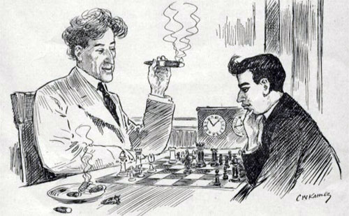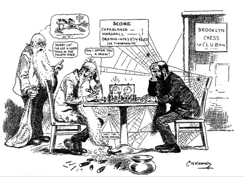 Карикатура из журнала «Чесс Уикли». Бруклинский шахматный клуб. Табло счета: «Капабланка – 7, Маршалл – 1, ничьих 456387496821(или около того)». Слева игроков поторапливает старичок-организатор с пустым денежным мешком. Маршалл (с характерной сигарой) снова предлагает ничью… |