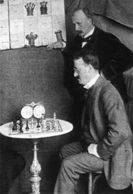 Они были такие разные: сдержанный Карл Шлехтер, суховатый, как сама его игра, и порывистый Жак Мизес, неисправимый любитель осложнений. Именно его трудами и партиями обрела имя и стала полноценным боевым дебютом скандинавская защита, прозябавшая прежде под кличкой «Ферзевая пешка против королевской». Эта защита и принесла Мизесу успех в необычном для того времени матче: оба игрока играли вслепую. Публика была потрясена не только самим фокусом, демонстрацией резервов человеческой памяти и воображения, но и высоким качеством, зрелищностью поединков.