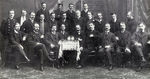 Участники турнира маэстро и организаторы турнира. Сидят слева направо: Видмар, Бернштейн, Ласкер, Берн, Шлехтер, Рубинштейн, Мизес, Сальве, Спейер; стоят посредине: Фон Фрейман, Дурас, Левин, С. Зноско-Боровский, Сосницкий, Князь Демидов Сан-Донато, Сабуров мл.,Чудовский, Перлис, Тартаковер, Тейхман; стоят наверху: Коэн, Форгач, Е. Зноско-Боровский, Шпильман. |