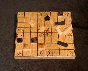 Фигуры раскрашены в 4 цвета - красные, чёрные, жёлтые и зелёные. Для определения хода используются продолговатые кости с четырьмя гранями. Если король становится на исходное поле другого короля ("занимает его трон"), то он получает управление над всеми фигурами данного цвета, а игрок выигрывает соответствующую ставку. Если король забирает короля противника на его троне, то выигрыш игрока удваивается.