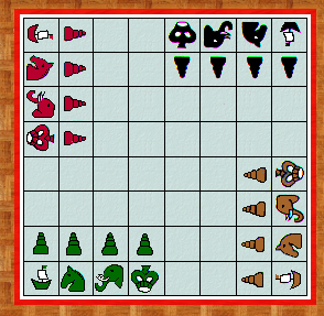 - ход на два поля со второй горизонтали разрешён пешкам "a", "d", "e" и "h", но только в том случае, если стоящая за пешкой фигура ещё не сделала ни одного хода;