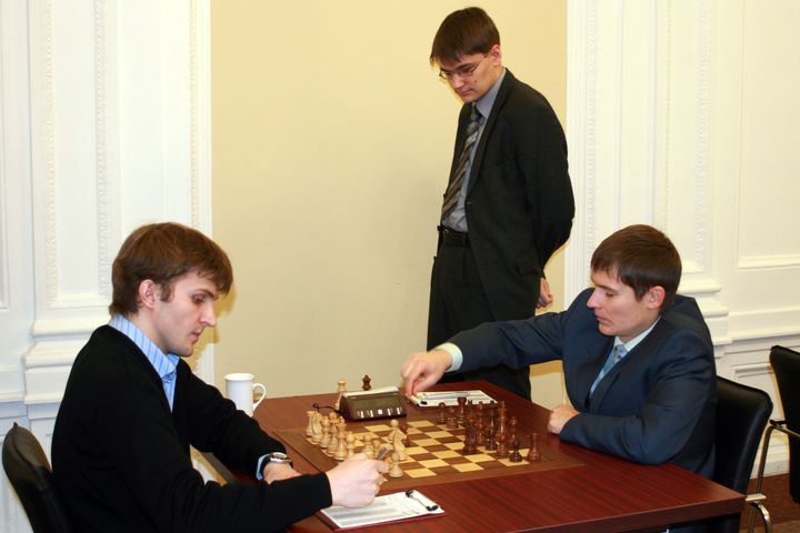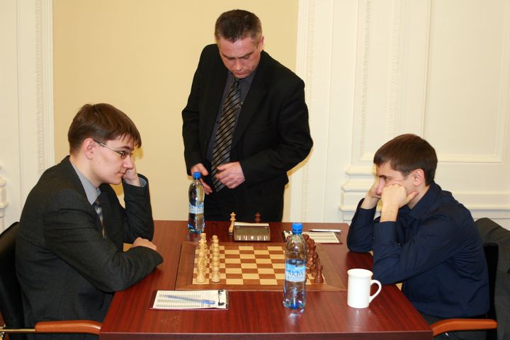 Евгений Томашевский наблюдает за партией Витюгова и Тимофеева |