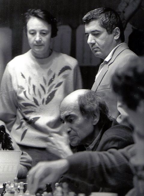 Последний чемпионат СССР, ноябрь 1991 г., Москва. Римма Билунова и Рафаэл Ваганян наблюдают за игрой Михаила Таля. |