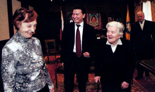 На открытии матча Спасский – Корчной (Элиста 2009 г.). Во втором ряду Кира Зворыкина, Римма Билунова и Петра Лееверик. |