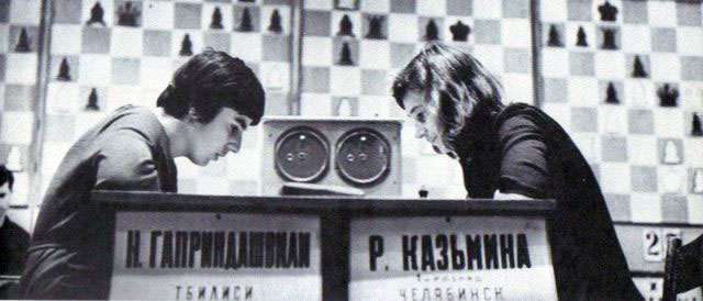 В 1956 году я впервые играла с Ноной. У меня сохранилась фотография (к сожалению, неважного качества): «Н. Гаприндашвили, 1 разряд (г. Тбилиси) – Р. Казьмина, 1 разряд (г. Челябинск)». Потом встречались с ней в чемпионатах СССР; я ужасно горжусь, что сделала с Ноной две ничьи!