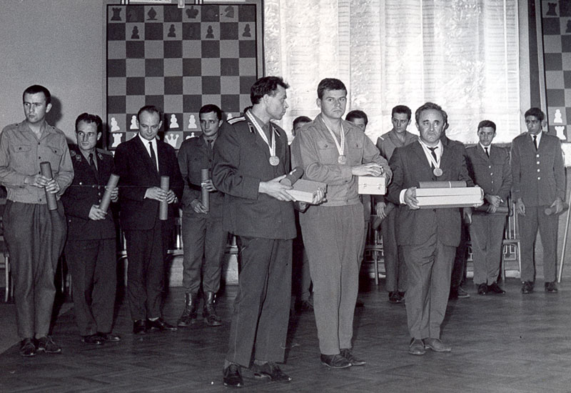 В 1954 г. я получил право на матч с мастером, но ушел в армию после техникума в Люберцах. Попал в ГСВГ, где пробыл в «шахматных войсках» до 1972 г. Жизнь в Германии была специфическая. Рыбалка была замечательной – таких угрей я никогда больше не ловил. Играть я мог сколько угодно. Выступал в первенствах ВС личных и командных, чемпионатах России. В середине 60-х ГСВГ решили «присоединить» к Белоруссии. И я в 1967 г. стал чемпионом Белоруссии. Исаак Ефремович Болеславский прокомментировал с юмором - «Только этого нам еще не хватало». Три раза я становился чемпионом Вооруженных Сил, а в команде – не помню сколько. Моя самая активная игра в Вооруженке пришлась на то время, когда министром обороны был страшный любитель шахмат маршал Родион Малиновский. Он обычно появлялся тура за два до конца, в гражданской одежке, смотрел партии от начала до конца, общался с участниками. Ко мне подошел во время партии с одесским кандидатом в мастера Л.Балмази, где я нанес мощный удар. Маршал сказал: “Да, солдат зевнул Ке4”. Устанавливал свои призы – именные часы. А за первое место награждали золотыми часами!