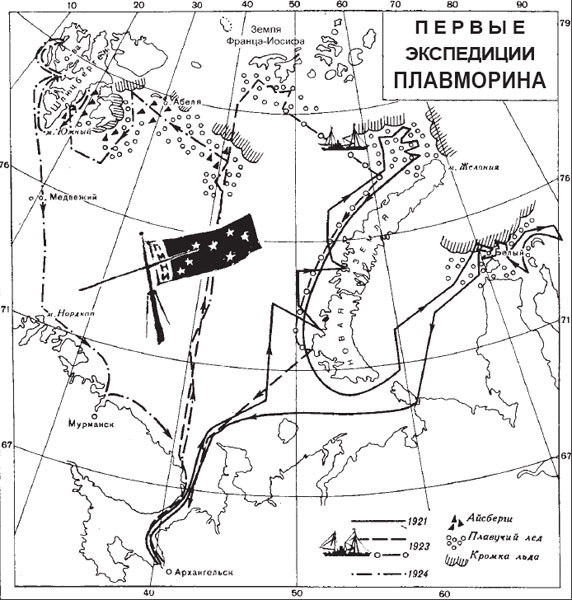 А с 1923 по 1928-й «Персей» исследовал Баренцево море, находясь в ведении Плавучего морского научного института. По карте первых экспедиций Плавморина можно мысленно прочертить маршрут «Персея» с врачом В. Платовым на борту, когда шхуна, выйдя с базы близ Мурманска, искала следы аэронавтов в акватории между Новой землей и Землей Франца Иосифа. В центре карты – семизвездный стяг «Персея».