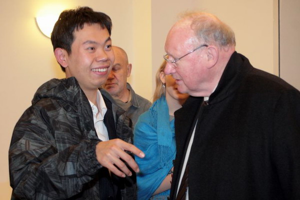 Главный судья Герт Гийссен пришел в пресс-центр поговорить с Ван Хао и потеснил журналистов |