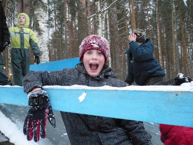 А рядом находится еще одно счастье для большого человека, с которого можно с визгом и улюлюканьем слететь носом прямо в снег – большая горка!