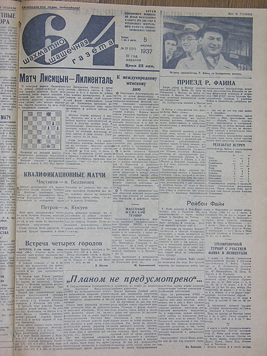 Добрая половина 1-й полосы газеты "64" за 5 марта 1937 года была посвящена приезду в Москву юного американского гроссмейстера. На Белорусском вокзале его встречали представители Всесоюзного комитета физкультуры, члены оргкомитета предстоящего тренировочного турнира, представители СМИ... По-моему, человек в шапке пирожком за спиной улыбающегося Файна – это Владимир Снегирев, тогдашний начальник шахматного отдела Комитета. "За непрезентабельной внешностью, – писал о Снегиреве М.Ботвинник, – скрывался настойчивый, умный и целеустремленный человек... Любопытно, что учился он в Москве в одной школе с чемпионкой мира Верой Менчик". С большой долей уверенности можно предположить, что именно Снегирев инициировал и организовывал тот визит Файна в СССР.