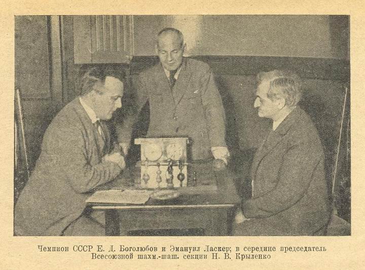 Первый московский международный, 1925 год. Боголюбов против Ласкера, за игрой наблюдает Крыленко.