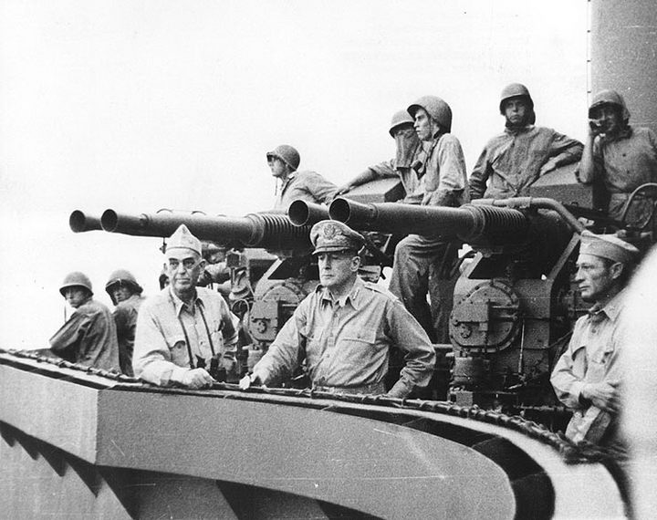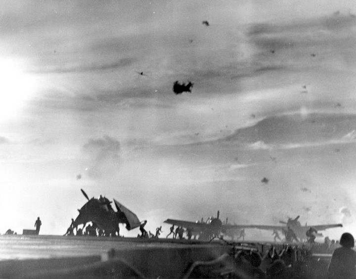 Атака «человека-бомбы» (11 апреля 1945 года) в битве за Окинаву на линкор «Миссури» (USS MISSORI BB-63): «Большой Мо», резко сманеврировав, успел подставить борт «круто пикирующему самолету»… И тот врезался в корабль ниже палубы, причинив лишь незначительное повреждение.