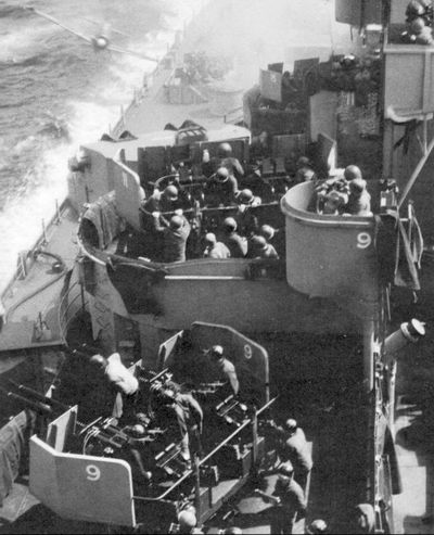 Третье. Эсминцы и малые суда должны маневрировать медленно – с тем, чтобы повернуться к самолету наивыгоднейшим образом, но при том не снижая точности зенитного огня".