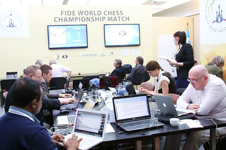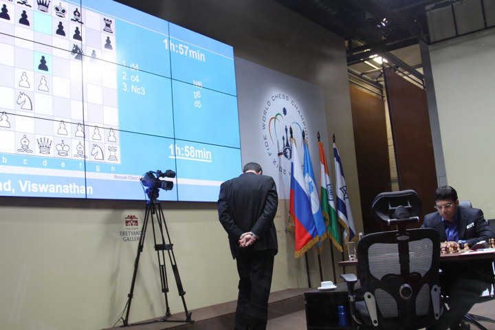Причем Гельфанд куда больше времени проводил, разгуливая по сцене, тогда как Ананд почти не поднимался со своего места... При этом показания часов говорили о том, что оба соперника, похоже, видят позицию впервые. И рисковать не хотят!