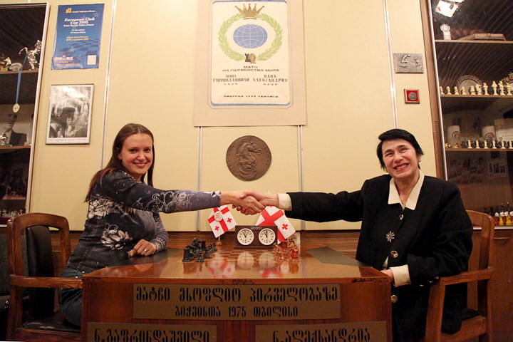 Нана Александрия присела вместе со своим бывшим тренером Марком Дворецким за шахматный стол, за которым игрался матч с Ноной Гаприндашвили в 1975-м. Вспоминали былые времена, многочисленные шахматные события, проходившие в Грузии. «Быть может, если бы мы начали работать с Вами раньше, я бы выиграла больше матчей», - с улыбкой сказала Нана Марку Израилевичу.