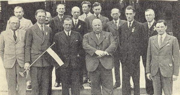 Победитель мюнхенской неофициальной олимпиады – сборная Венгрии. В 1-м ряду 2-й слева – Геза Мароци, 2-й справа – Гедеон Барца. Во 2-м ряду крайний справа – Янош Балог, затем А.Гаваши и Ласло Сабо. Крайние слева: в 1-м ряду – неоднократный чемпион Венгрии Эндре (Андреас) Штейнер, за ним его младший брат Лайош. Эндре погиб 29 декабря 1944-го в концлагере. Лайоша спасло то, что он с 1939-го обосновался в Австралии, чемпионаты которой неоднократно выигрывал, начиная с 1945-го. |