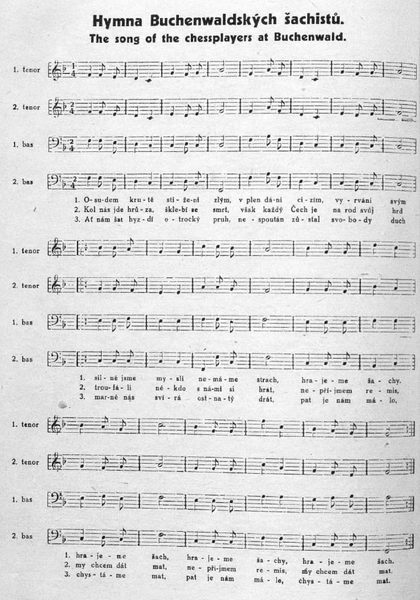 Ноты и слова шахматного гимна Бухенвальда (созданного в его бараках чешскими антифашистами) и "Список участников" (из статьи д-ра Полански "Шахматы в Бухенвальде" в том же №5-6 "Ческословенски шах" за 1945 г.) Бухенвальдского мемориала 1940 года, вероятно, первого в страшном лагере близ Веймара шахматного состязания. |